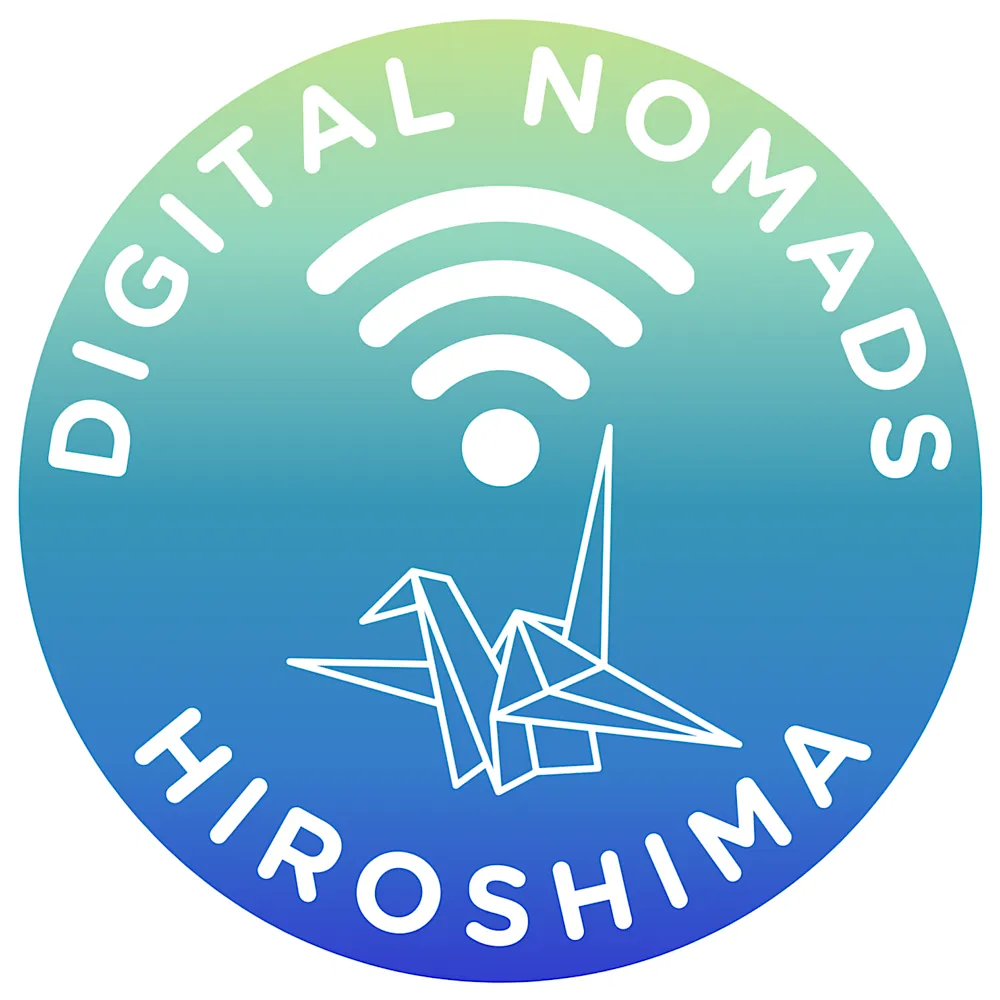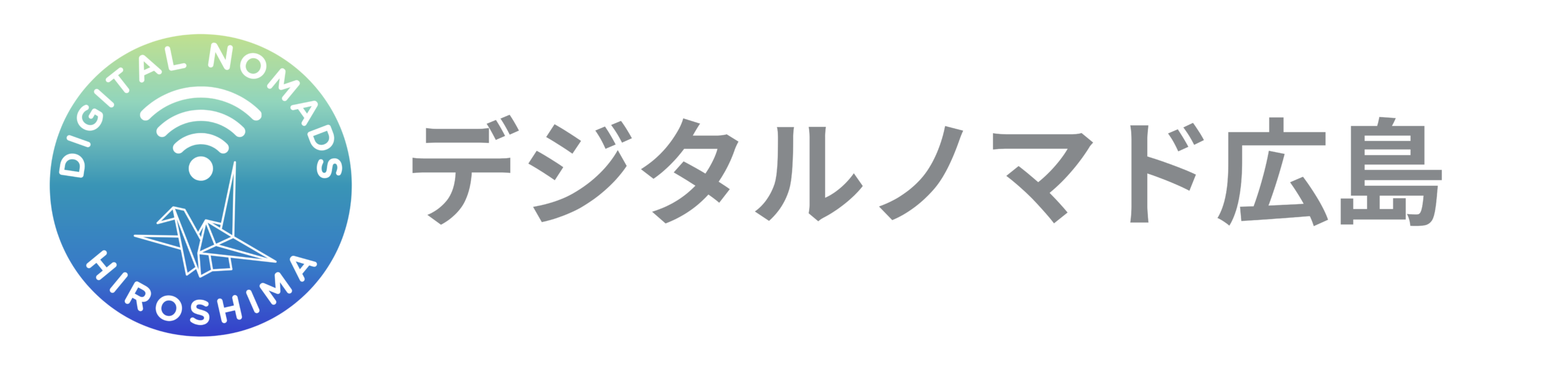 デジタルノマド広島のロゴは、中国山地の緑と瀬戸内海の青を基調に、平和都市・広島の象徴である「折り鶴」と、デジタルノマドを象徴する「Wi-Fiマーク」を組み合わせたデザインです。